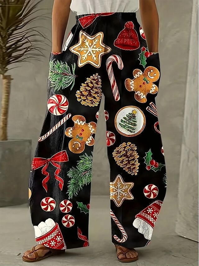 Women's Wide Leg Chinos Vacation Vintage Ethnic Style Full Length High WaistPantsUgly Christmas Graphic Christmas Elastic Waistband Inelastic Formal Vacation Street Black Pink Summer Spring Loose Fit 7