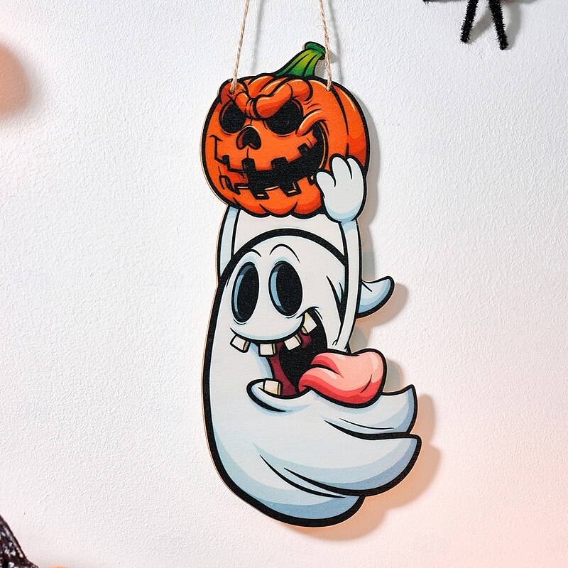 HOT ! 2PCS Halloween Wooden Wall Hangings – Colorful Cartoon Ghost & Pumpkin Decorative Signs, Indoor Party Decorations for Home, Family, and Halloween Themed Wall Display