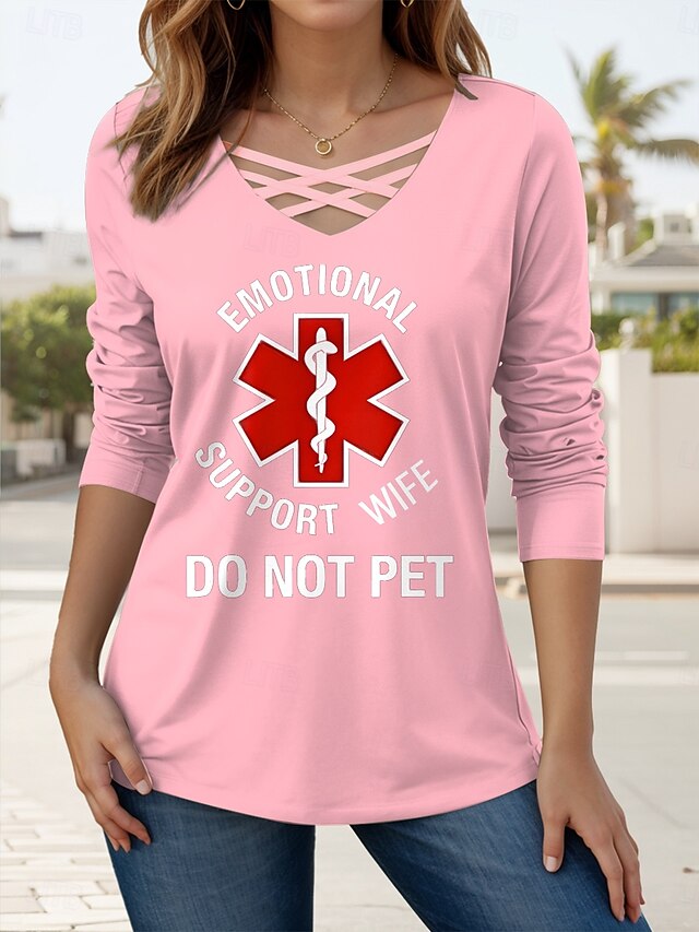 Women's T Shirt Graphic Letter Casual Long Sleeve V Neck Regular Tops Daily Cut Out Print Black Pink Green Spring Fall 7