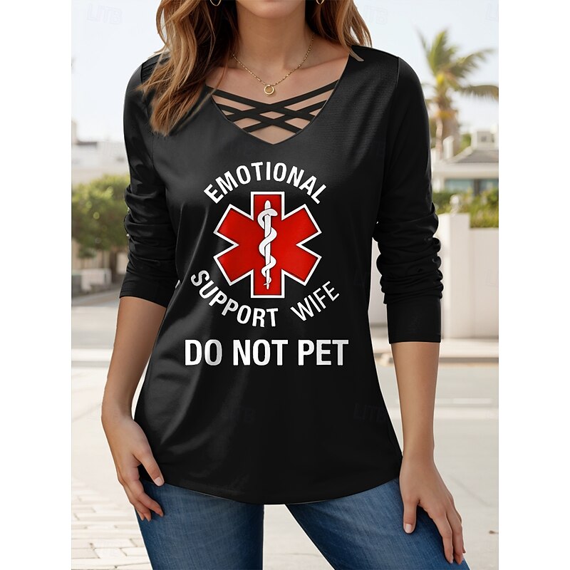 HOT ! Women's T Shirt Graphic Letter Casual Long Sleeve V Neck Regular Tops Daily Cut Out Print Black Pink Green Spring Fall