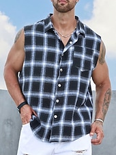 More information about Men's Shirt Summer Shirt Casual Shirt Beach Shirt Button Up Shirt Checked Shirts Black Sleeveless Plaid / Check Lapel Vacation Daily Front Pocket Clothing Apparel Cotton Cotton Blend Fashion Casual