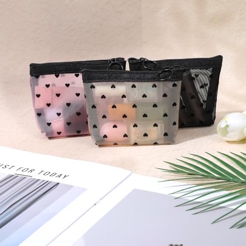 HOT ! 3Pcs Mini Heart Mesh Makeup Bag with Zipper, Mesh Cosmetic Bags Heart Print Zipper Pouch Travel Accessories Storage Small Purse Bag for Women Lipstick Makeup Organizer 3 Colors