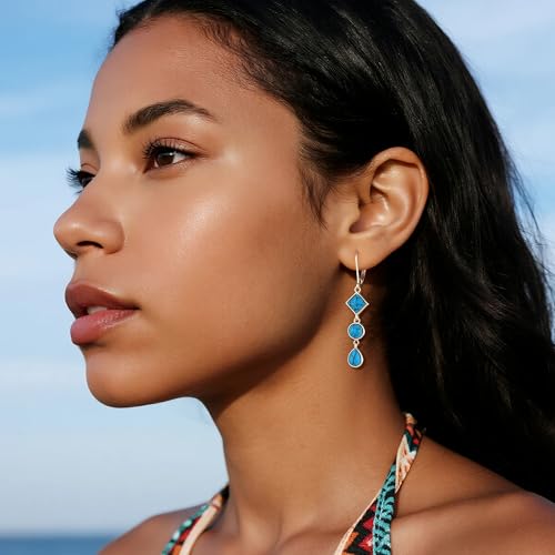 • Turquoise Jewelry for Women Trendy: These turquoise earrings for women are the perfect blend of timeless style and modern design. Geometric turquoise elements make them a standout piece of Western jewelry. Their unique design and boho charm make them versatile enough for any look, from casual denim to flowing dresses.