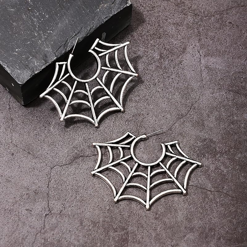 HOT ! Gothic Spider Web Open Hoop Earrings for Women, Large Statement Design, Antique Silver Finish Lightweight Hoop Earrings