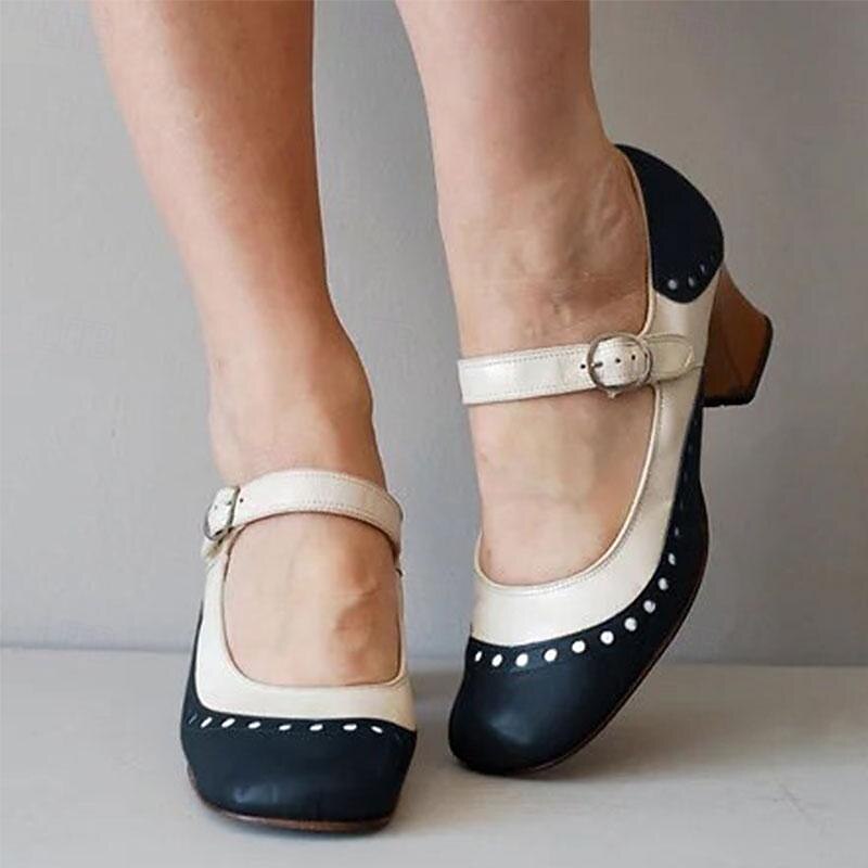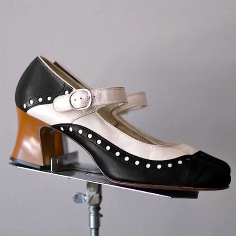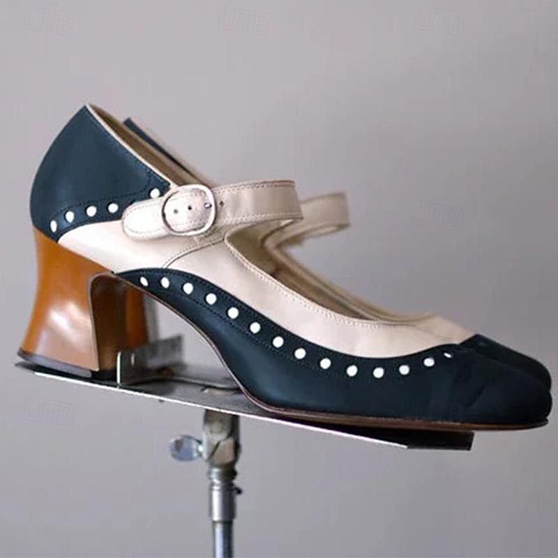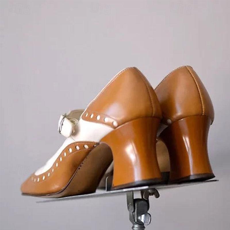 Highlights [Fabric] : Crafted from high-quality faux leather, these pumps sandals feature a creamy white and warm brown material blend for a classic and durable finish. The leather’s smooth texture adds a luxurious touch suitable for spring and summer styles. [Silhouette] : These elegant Mary Jane shoes are designed with a vintage silhouette, featuring a rounded toe and a mid-height chunky heel. This combination offers a sophisticated yet comfortable fit, perfect for daily and outdoor activities. [Design Highlights] : The shoes boast a unique two-tone design, adorned with tiny perforated details that enhance their vintage charm. An adjustable ankle strap with a silver buckle ensures a secure and personalized fit, while the rounded toe and block heel enhance both comfort and style. [Occasions] : Ideal for both casual and semi-formal settings, these pumps are versatile enough for daily wear or outdoor events. Their elegant design makes them an excellent choice for anything from a casual day outing to a more dressed-up occasion. [Size Notice] : Available in a range of sizes from US5.5 to US10.5, these shoes are designed to fit comfortably according to standard sizing. It is recommended to choose your usual size for the best fit.