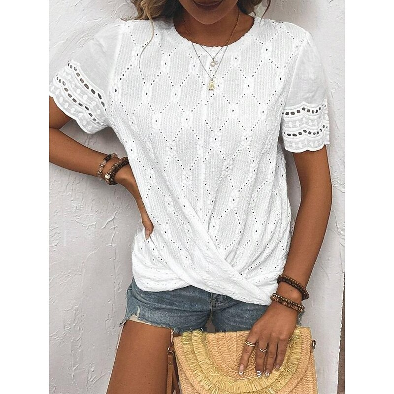 HOT ! Women's Blouse Elegant Modern Solid Color Eyelet Short Sleeve Crew Neck Daily White Summer