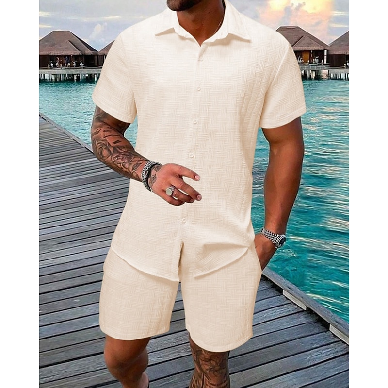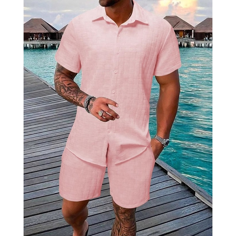HOT ! Men's T-shirt Suits 2 Pieces Outfits Tee & Shorts Short Sleeve Shirt Collar Summer Plain Fashion Casual 2 Piece Vacation Daily Wear Going out Black White Pink Top Tee for Men