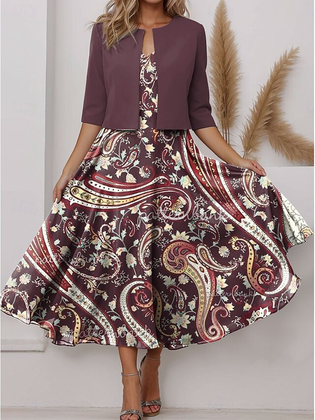 HOT ! Women's Two Piece Dress Sets Midi Dress with Jacket Elegant A Line Dress Half Sleeve Party Semi Formal Floral Graphic Print V Neck Party Wedding Guest Black Blue Purple Regular Fit