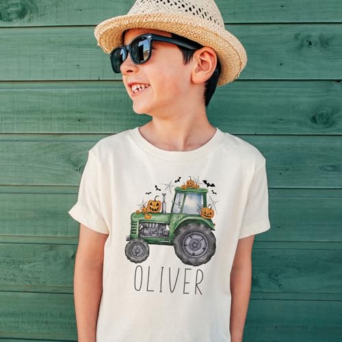 Personalized Kids Halloween Tractor T-Shirt - Custom Spooky Green Farm Tractor - Fun Halloween Shirt with Jack-o'-Lantern Pumpkins - Customizable with Child’s Name - Natural Toddler Youth Tee 7