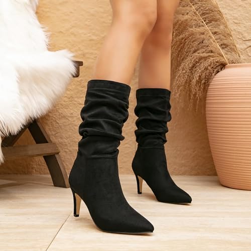 Women's Pleated Mid-Calf Boots - Casual Pointed Toe Booties with Stiletto Heel for Fall Winter & Daily Wear 7