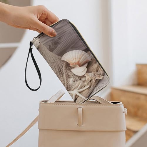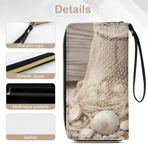 • 【Wristlet Women's Wallet】 The Coastal Fishing Net Shell purse is made of high-quality PU leather, with sturdy wrist strap, safe and portable, easy to take cards, cash and other things.