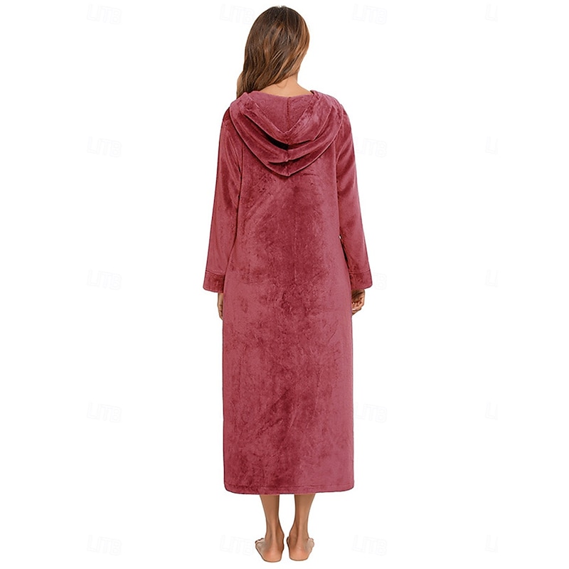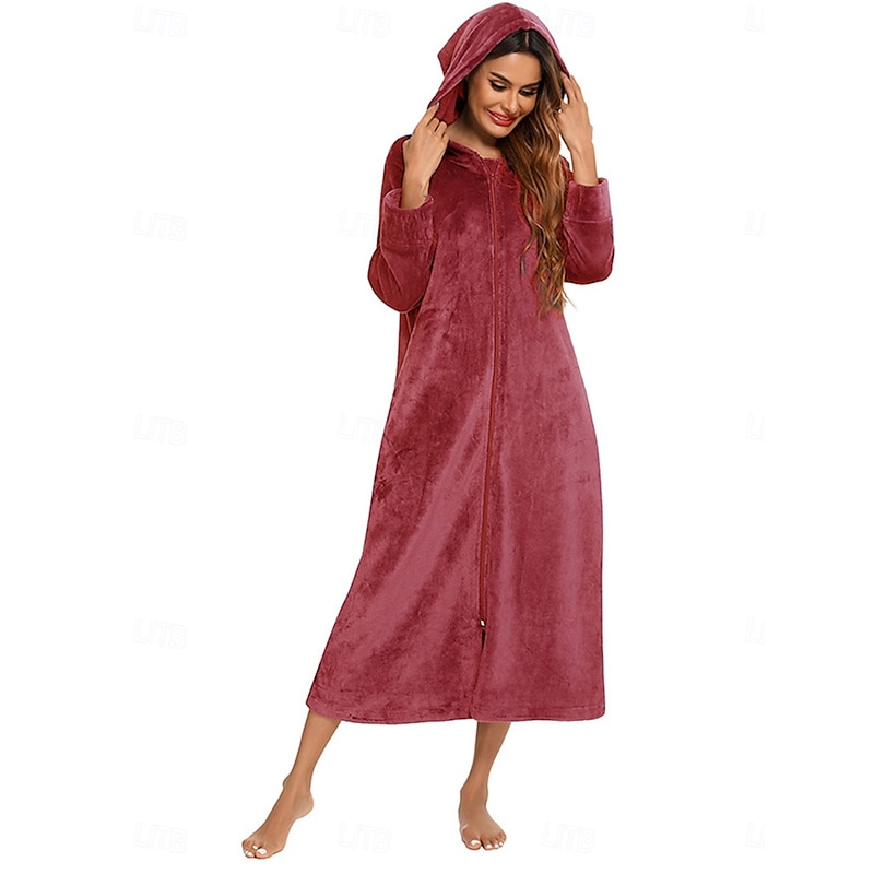 Highlights [Fabric] : Crafted from a luxurious blend of polyester and fleece, this women's robe offers a plush, soft feel against the skin. The high-quality material is designed to provide exceptional warmth and comfort, making it ideal for colder months. [Fit] : This long robe features a relaxed, flowing fit that extends down to the ankles, ensuring full body coverage and freedom of movement. Its design allows for both comfort and a stylish silhouette suitable for home wear. [Design Highlights] : The robe boasts a chic hooded design, adding an extra layer of warmth and style. The front zipper closure offers ease of wear, while practical side pockets provide convenience for carrying small essentials. [Occasions] : Perfect for lounging at home during the fall and winter seasons, this robe is an ideal addition to your bedtime routine. Whether you're relaxing on the weekend or winding down after a long day, it combines comfort with elegant style for any home setting. [Size Range] : Available in multiple sizes, including S, M, L, XL, and 2XL, to accommodate a variety of body shapes and preferences, ensuring everyone finds their perfect fit.