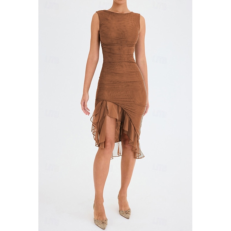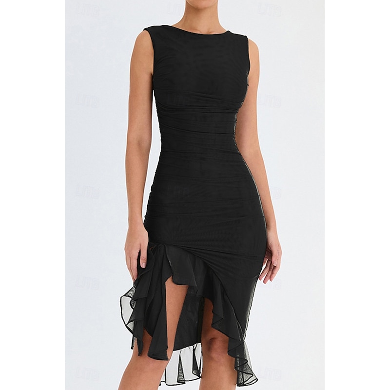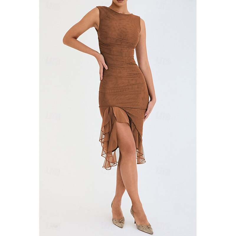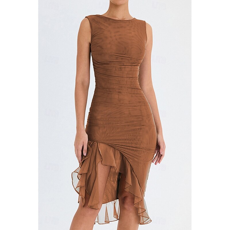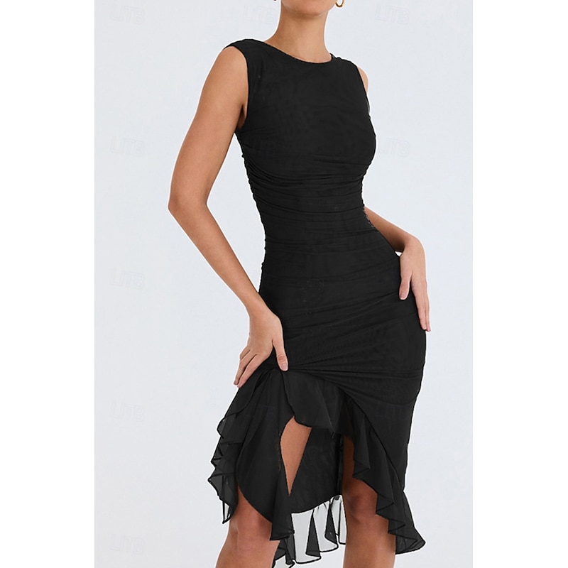 Highlights - Perfect for summer weather - Made of high-quality polyester fabric - Stylish sleeveless design - Specifically designed for women - Flattering sheath dress silhouette - Features ruched and mesh detailing - Classic crew neck neckline - Trendy midi dress length