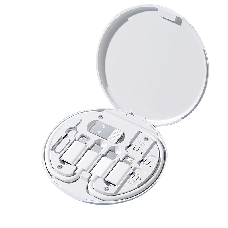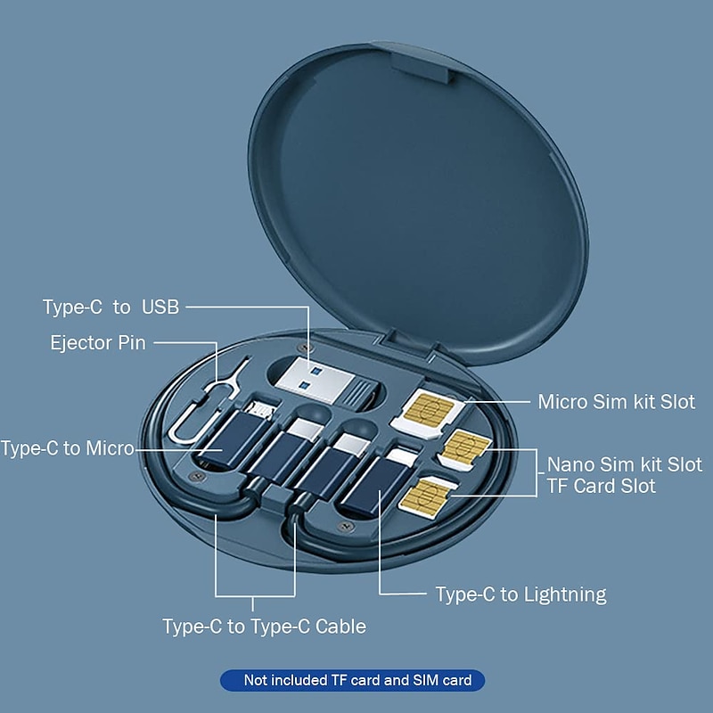 Highlights - Safe charging and data transfer with four different ports for converting, charging, and transferring. - Includes USB C cable with 3 USB adapters for easy charging and data transfer to And-roid/IOS devices. - All-in-one charging solution with a portable storage case that prevents cable ends from getting tangled in the bag. - Durable adapters made of scratch-resistant aluminum alloy with larger and thicker copper wires for faster charging and data transfer. - Small and portable cable kit (82.5*10mm) that easily fits into your pocket, purse or bag with a card picking pin that perfectly fits the periphery of your mobile phone. - Multifunctional storage case with 3 storage slots (2 for nanos SIM and 1 for micro SIM storage -SIM not included) and a SIM eject tool to help you store and change SIM cards, and also doubles as a phone holder.
