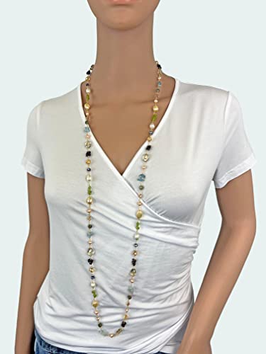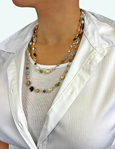 More information about Hand Crafted Wire Wrapped Multi-Shape Multi-Color Gemstone Cultured Freshwater Pearl Wire Beaded Chain Station Necklace, About 45” Long.