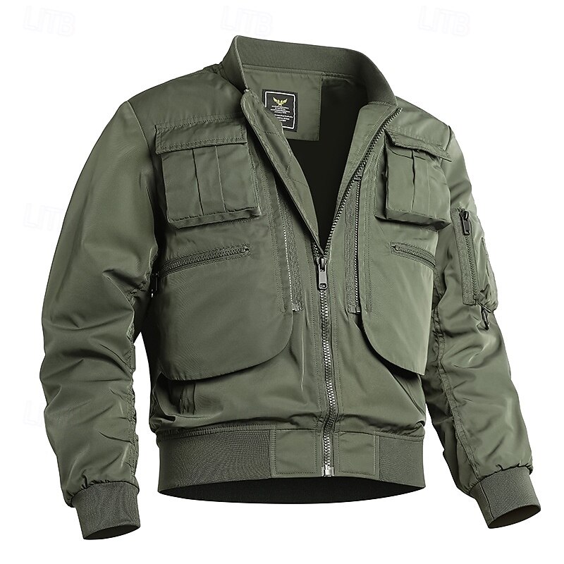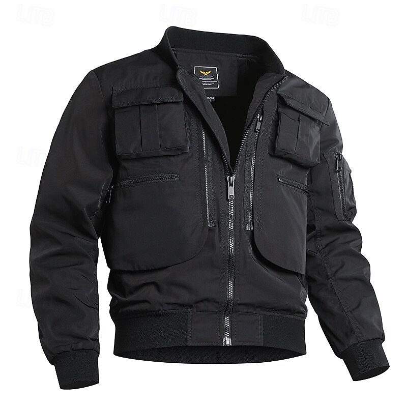 Highlights [Fabric] Crafted from high-quality polyester, this men's bomber jacket is both lightweight and durable, offering excellent resistance to the elements while ensuring comfort and ease of movement. [Fit] Featuring a regular fit with ribbed cuffs and a waistband for a snug, wind-resistant design, this jacket is perfect for fall and winter climates. The hooded neckline adds an extra layer of warmth and protection, making it a reliable choice for cooler weather. [Design Highlights] The jacket's modern zip-up front closure and multiple utility pockets on the chest and sleeves not only provide practicality for carrying essentials but also enhance its rugged and stylish appearance. These functional elements, along with its solid color options, contribute to a versatile and contemporary look. [Occasions] Ideal for a range of activities, this jacket is suitable for sports outdoor adventures, including camping and hiking, as well as casual daily wear. Its waterproof and windbreaker qualities ensure you stay warm and dry, making it perfect for various outdoor events and locations. [Size Notice] Available in a variety of sizes from XS to L, catering to different body types and providing a comfortable fit for everyone. Choose from classic colors such as Black, Dark Green, and Khaki to best suit your personal style.
