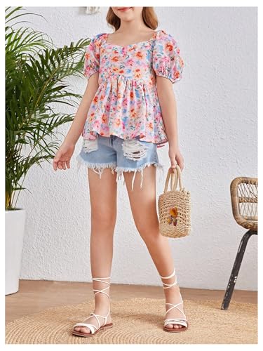SweatyRocks Girl's Floral Print Cute Peplum Top Puff Sleeve Smocked Ruffle Shirts 5