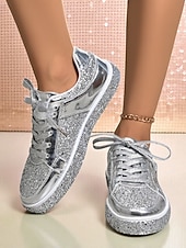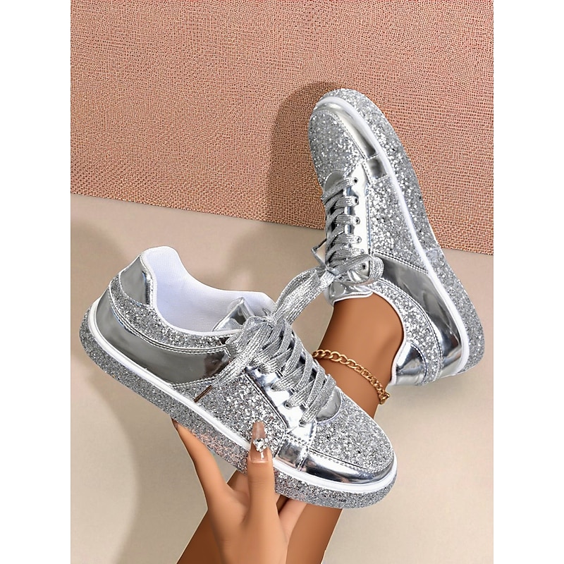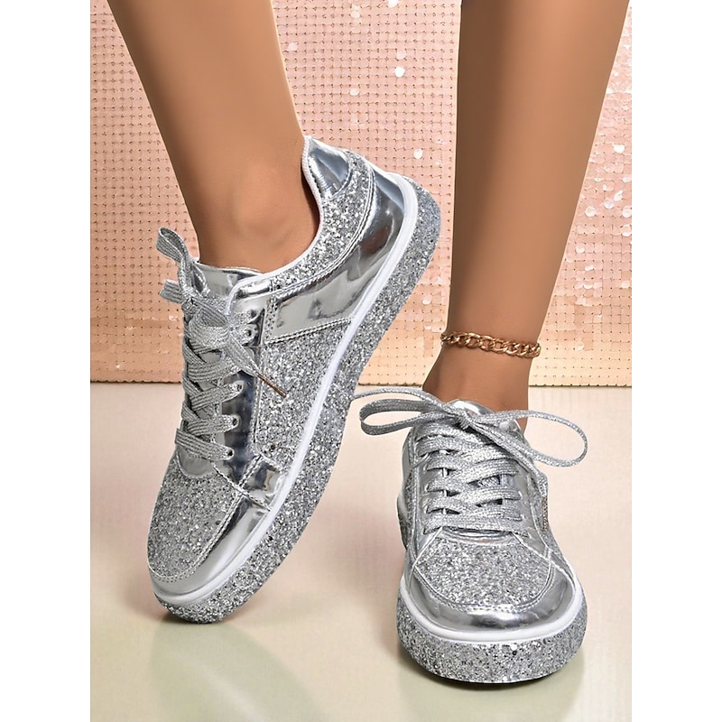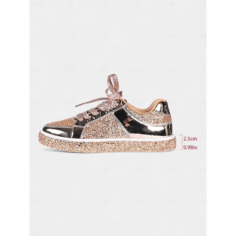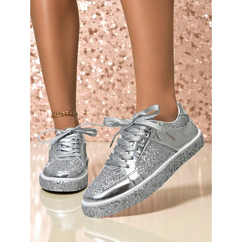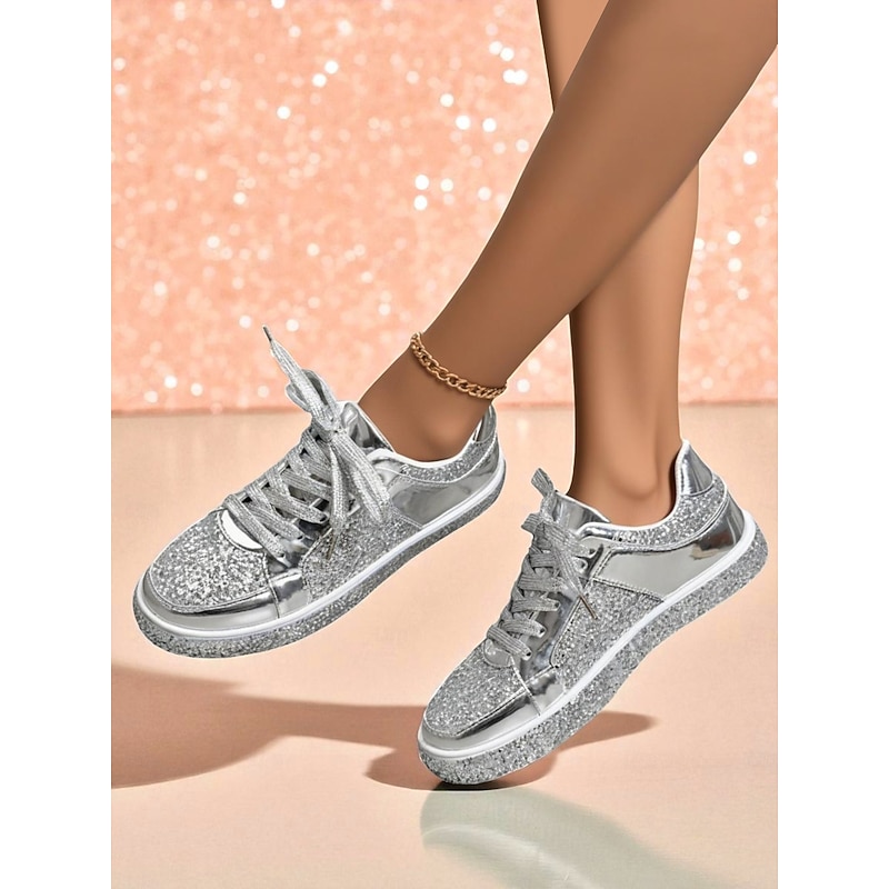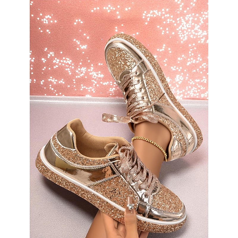 HOT ! Women's Gold Glitter Sneakers - Shiny Lace-Up Casual Shoes with Sparkly Design for Nightlife, Clubbing and Party Outfits