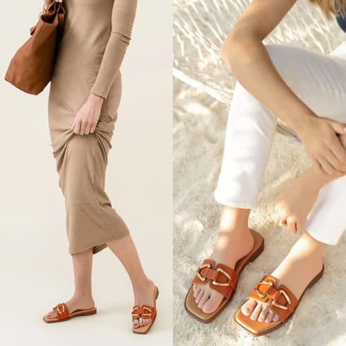 mazeskin Women's Square Open Toe Dressy Slide Sandals Cute Summer Comfortable Flat Slippers with Metal buckle 6