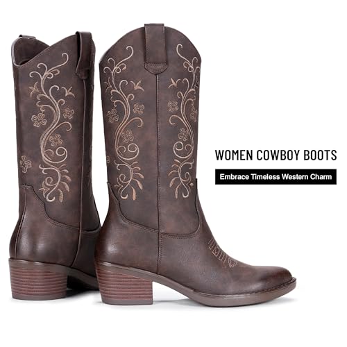 Vepose Women's Cowboy Boots, Embroidered Western Mid-Calf 9802 Cowgirl Boots, Pointed Toe Pull on Boots with Chunky Heel 5