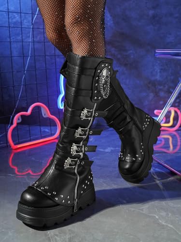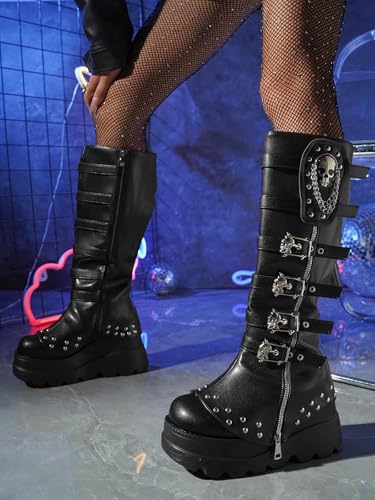 Women's Knee High Wedge Platform Boots Round Toe Punk Goth Mid Calf Motorcycle Combat Boot Metal Buckle Chunky Heel Boots 4