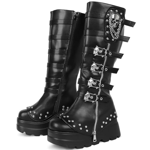 More information about Women's Knee High Wedge Platform Boots Round Toe Punk Goth Mid Calf Motorcycle Combat Boot Metal Buckle Chunky Heel Boots