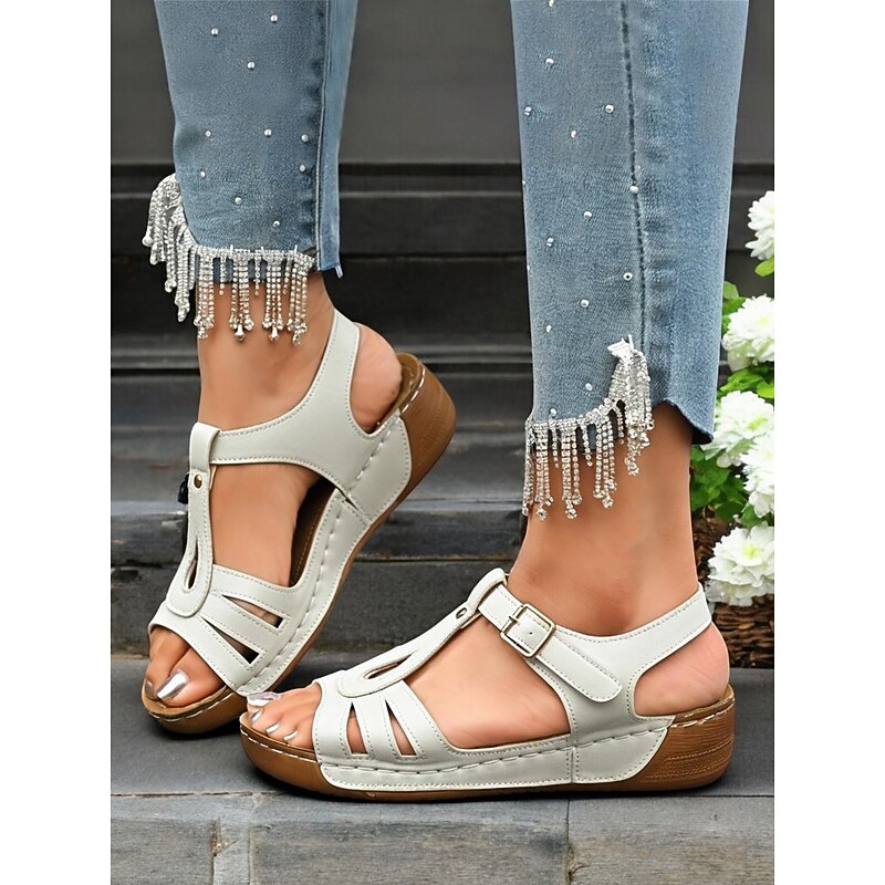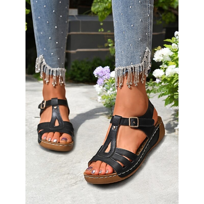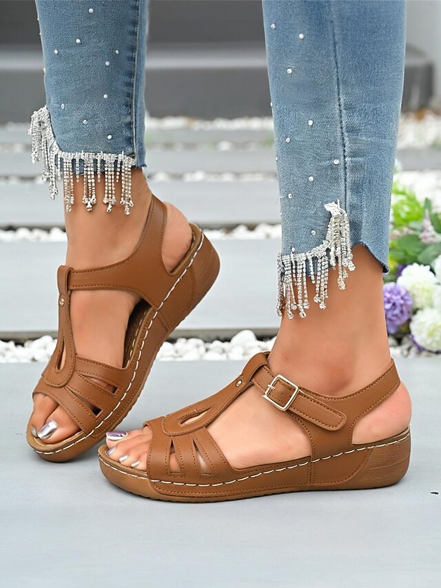 HOT ! Brown T-Strap Buckle Flat Sandals for Women - Comfort Faux Leathe Sandals for Everyday Wear & Outdoor Activities