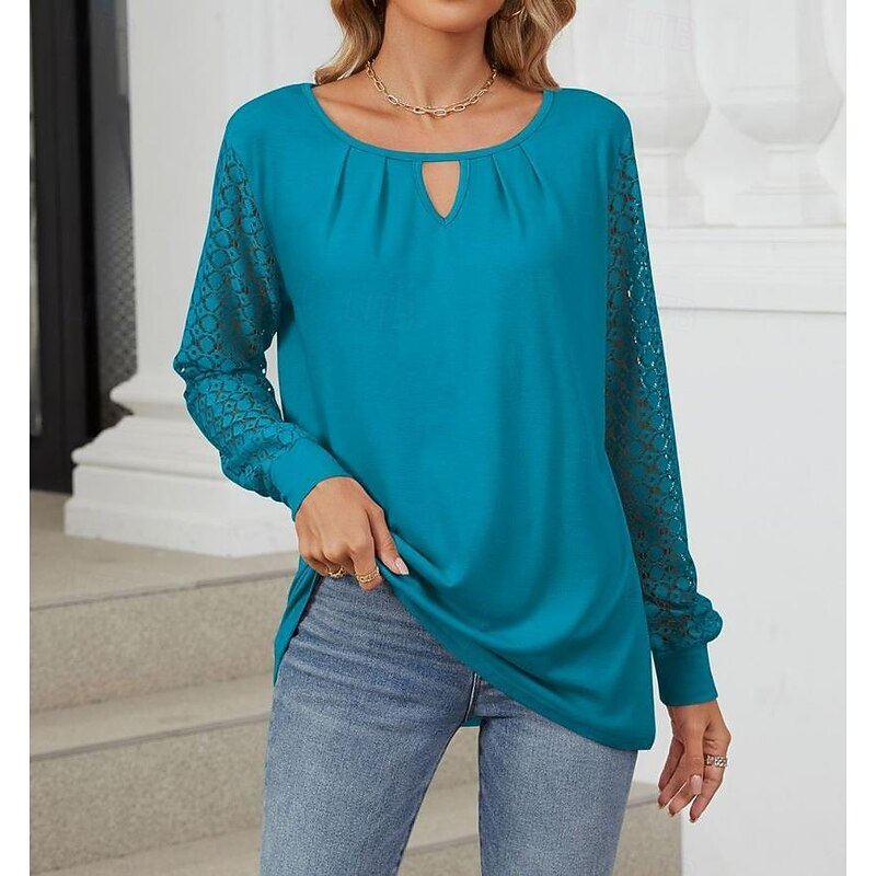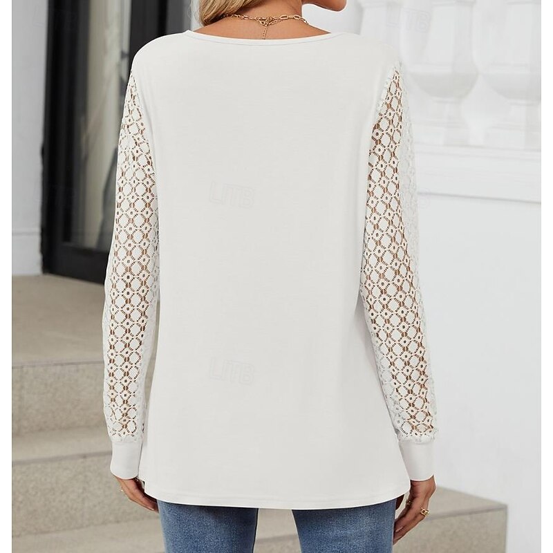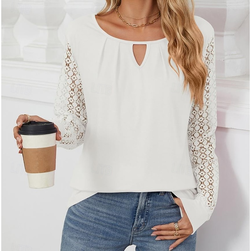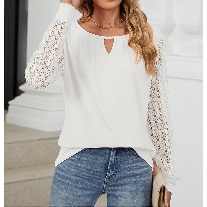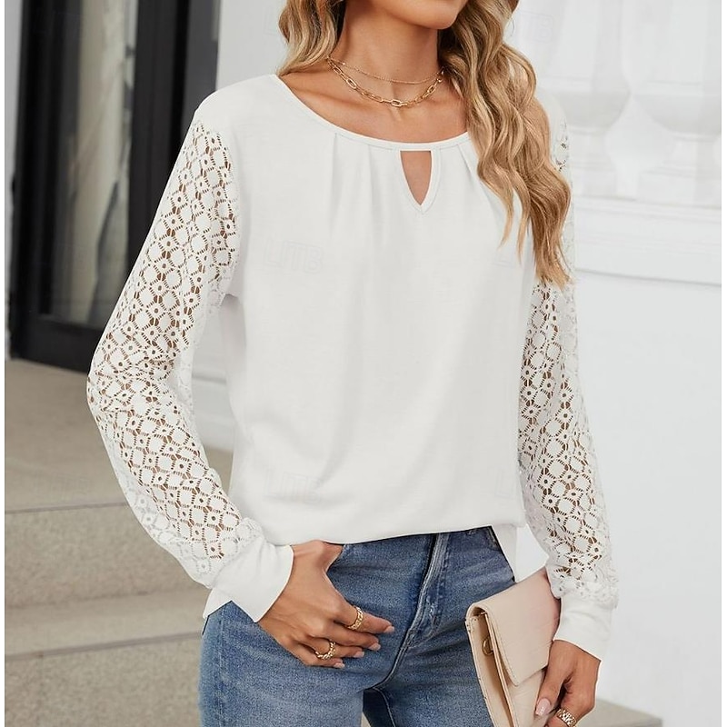 Highlights [Fabric]: Crafted from a blend of polyester and rayon, this women's blouse offers a comfortable and breathable feel, perfect for Spring, Fall, and Winter seasons. The micro-elastic fabric contributes to a relaxed wearing experience, ideal for daily activities. [Fit]: Featuring a loose fit, this blouse is designed to offer a chic and effortless look. Its solid color design and modern style make it easy to pair with jeans or skirts, ensuring versatility in your wardrobe. [Design Highlights]: With a crew neck and a subtle front cutout, this blouse adds a touch of flair to a classic design. The intricate lace long sleeves provide a delicate and feminine touch while the backless and mesh patchwork details enhance its elegance and style. [Occasions]: Perfect for daily outings and casual gatherings, this stylish and modern blouse suits various occasions. Whether you're out for a weekend brunch or a casual day at work, this top adds a touch of elegance to your ensemble. [Size Range]: Available in sizes S, M, L, XL, and 2XL, ensuring a suitable fit for a variety of body types.