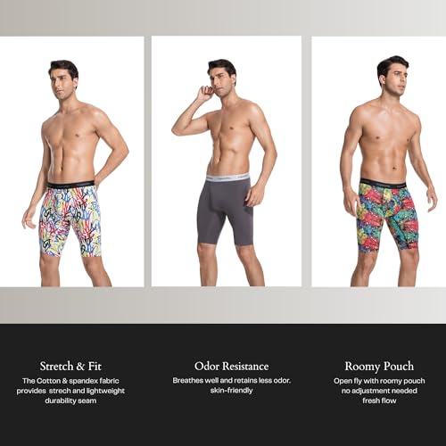 • Open Fly – Roomy double-layered crotch mens long leg boxer briefs; The 3D U-Shaped cutting support pouch with fly opening mens cotton underwear; supportive fly front, manmade 9 inch boxer briefs for men