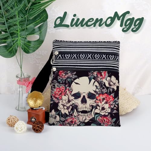 Floral Skull Messenger Bag Small Ethnic Pattern Printed Adjustable Strap Crossbody Zipper Pouch Floral Skull Phone Organizer Wallet Cute Shoulder Handbag for Women 5