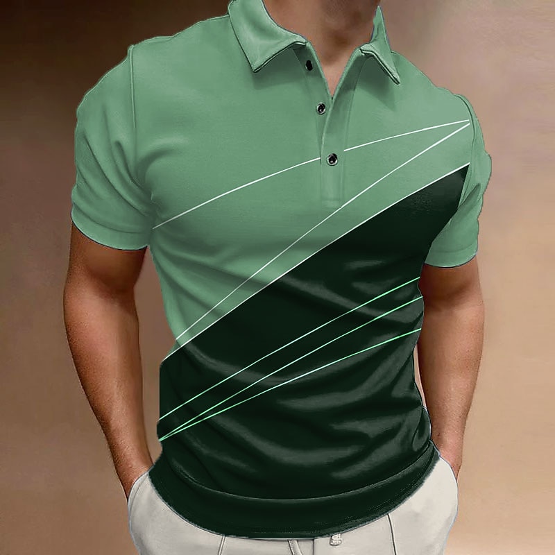 This men's polo features a striking geometric pattern with 3D print, available in a range of colors including blue, green, red, gray, khaki, and royal blue. The subtle combination of colors and the eye-catching design enhance the overall look, making it a versatile piece for any wardrobe.