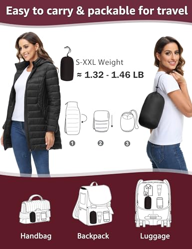 • Flattering Your Figure - This long travel puffer jacket features 2 side panel stitching to accentuate your beauty. Appropriate length to cover hips and thighs, enhancing your silhouette and adding a touch of sophistication to any outfit