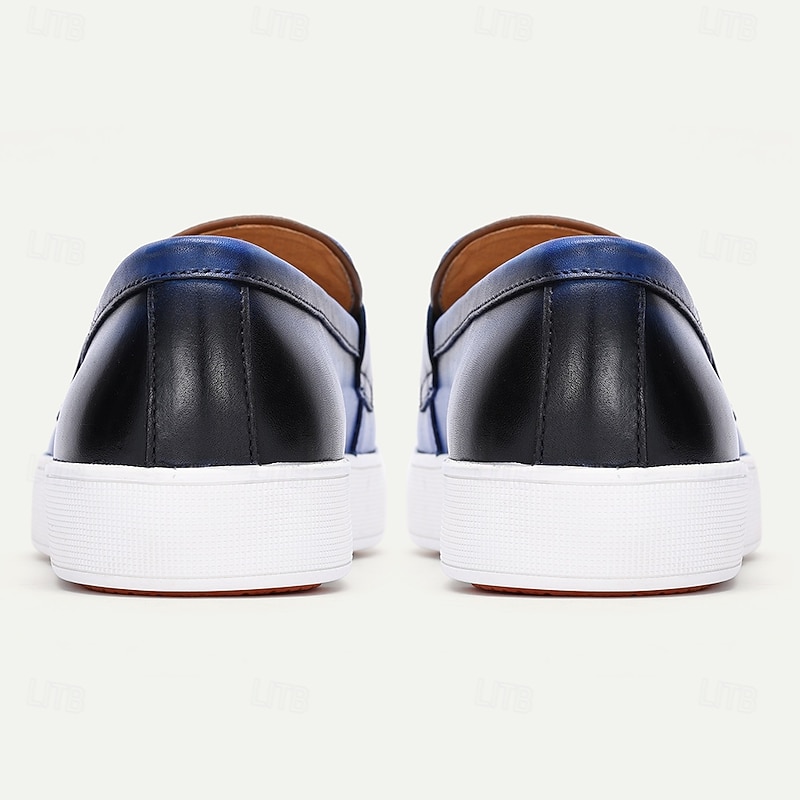 Highlights [Fabric and Build] : Crafted from premium Italian full-grain cowhide, these men's loafers offer both durability and a luxurious feel. The leather lining enhances overall comfort and breathability for all-day wear. [Styling] : Designed with a sophisticated blue hue, these loafers feature a croc-embossed texture that adds a modern flair to the classic loafer shape. The round toe design and sleek low-top profile ensure a comfortable and stylish fit. [Design Highlights] : A prominent blue tassel detail on the vamp elevates the loafers' refined appearance, while the white rubber outsole offers excellent traction and a sleek contrast to the rich blue leather. This combination of elements creates a versatile and contemporary look. [Occasions] : Perfect for both formal and casual settings, these loafers transition seamlessly from business casual environments to relaxed weekend outings. Whether at a corporate event or a casual get-together, they add a touch of elegance to any ensemble. [Size Range] : Available in a broad range of sizes, from US6 / EU39 / UK5 to US13 / EU46 / UK12, ensuring a suitable fit for a variety of foot sizes.
