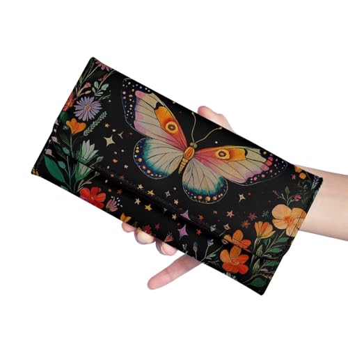 Night Butterfly Flowers Women Slim Wallet Black Long Trifold Clutch Checkbook Wallets, Painting Butterfly Stars Print PU Leathers Wallet Purse Credit Card Holder 1