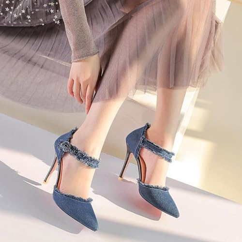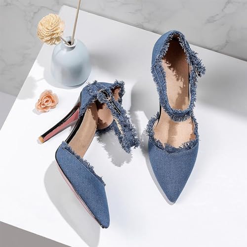 Women’s Denim Tassel Pointed Toe Stiletto Pumps with Ankle Strap Sexy Cutout High Heels Wedding Party Dress Pumps Prom Daily Classic Office Lady Work Shoes 7