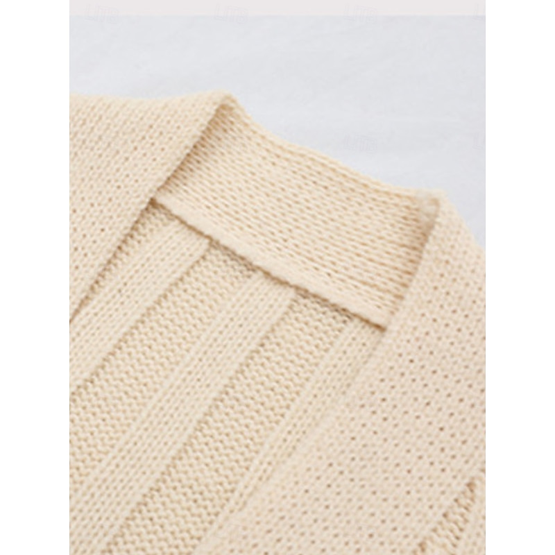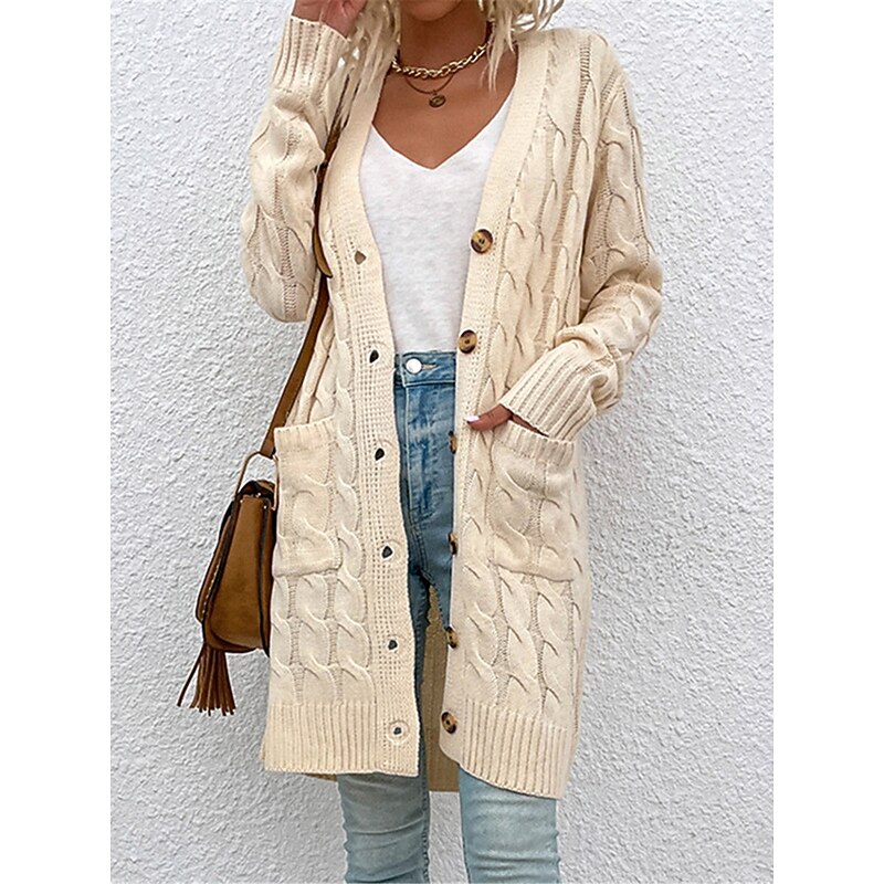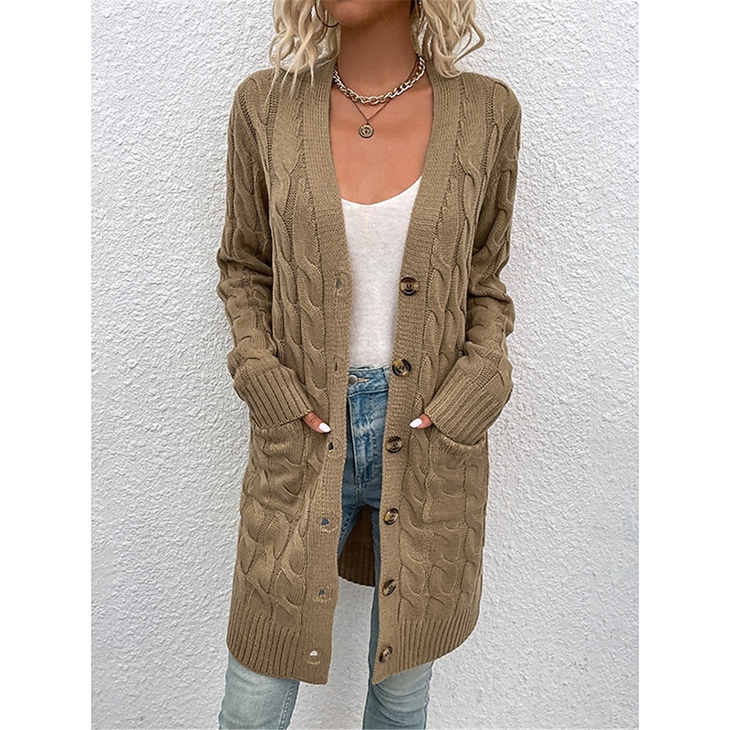 Highlights [Fabric] : Crafted from high-quality polyester, this women's cardigan offers a micro-elastic knit that provides comfort and warmth throughout the fall and winter seasons. The ribbed knit style adds a cozy texture and enhances the sweater's overall durability. [Fit] : This long, loose-fit cardigan drapes gracefully over the body, providing an easy fit that's perfect for layering. Its long sleeves add to the warmth, making it an ideal choice for cooler weather. [Design Highlights] : Featuring a classic V-neck and open-front design, this cardigan is adorned with large, wooden buttons for a secure closure and stylistic appeal. Two front pockets offer practicality and a touch of casual elegance, making it a versatile piece for any wardrobe. The combination of its ribbed knit texture and the pure color pattern makes it a timeless and adaptable choice. [Occasions] : Great for daily outings, outdoor activities, or relaxed weekend gatherings, this cardigan suits a variety of casual occasions. Its neutral tones and simple design allow for easy pairing with other pieces, whether you’re dressing up or keeping it casual. [Size] : Available in a range of sizes from S to XL, this cardigan caters to different body types, ensuring a comfortable and flattering fit for all.