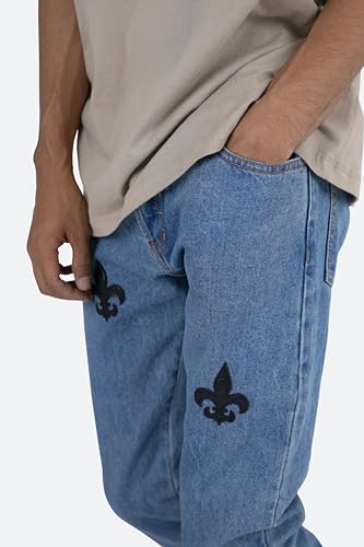 • D112 Fleur Denim is designed with our new D fit which is relaxed throughout with an extended inseam for stacking and features a warm, vintage wash, with whiskering and sanding throughout, and finished with poly-leather fleur de lis appliques throughout.