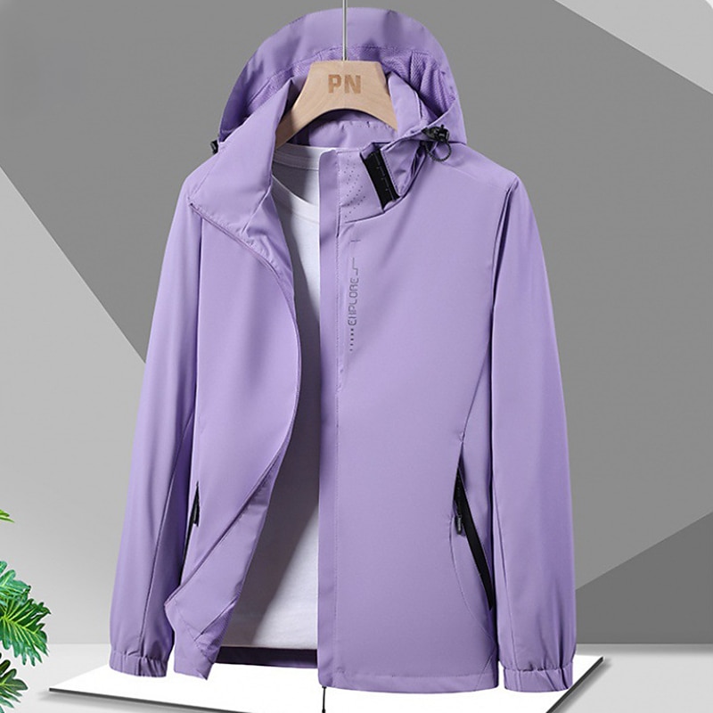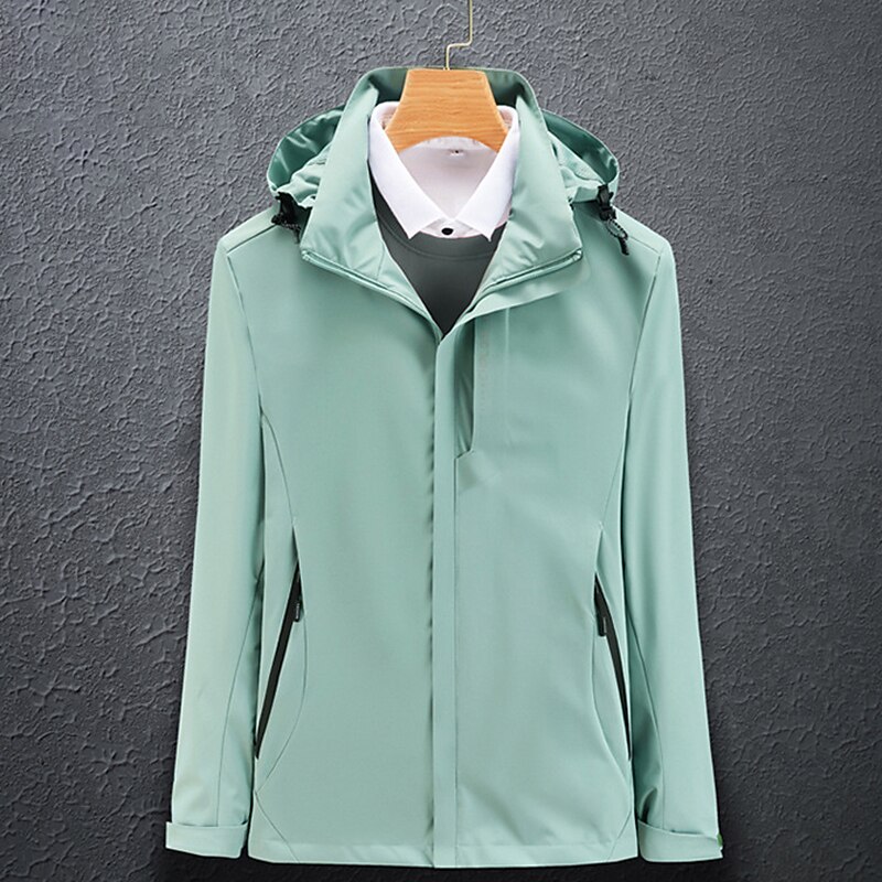 : This hiking windbreaker boasts a full-length hidden zipper, enhancing its clean aesthetic. It comes with convenient front zippered pockets for secure storage and an adjustable hood for added protection and versatility, perfect for diverse weather conditions.
