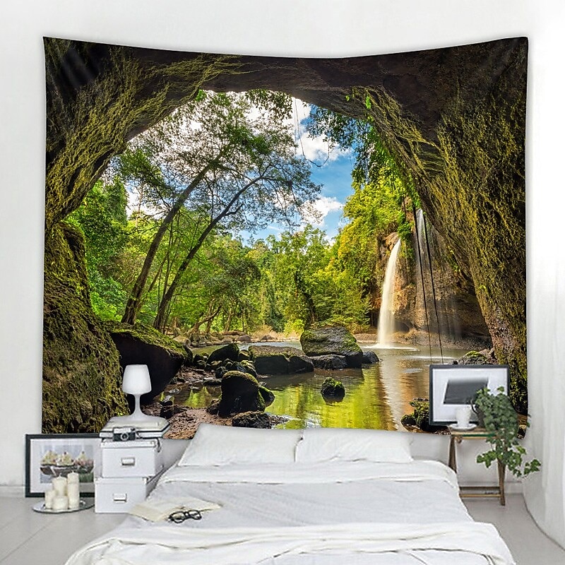 Large Wall Tapestry Art Decor Blanket Curtain Hanging Home Bedroom Living Room Decoration Hillside Green Trees Green Grass River Polyester 15