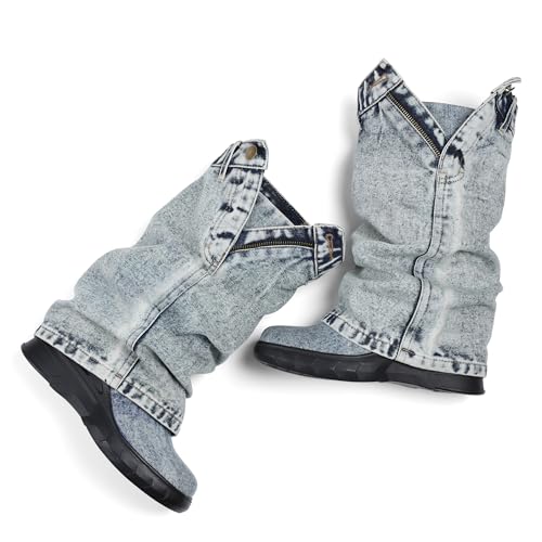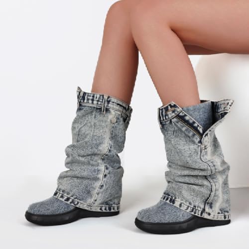 Kalstage Womens Denim Mid Calf Boots Fold Over Slouchy Platform Wedge Booties Vintage Y2k Shark Jean Boots 5