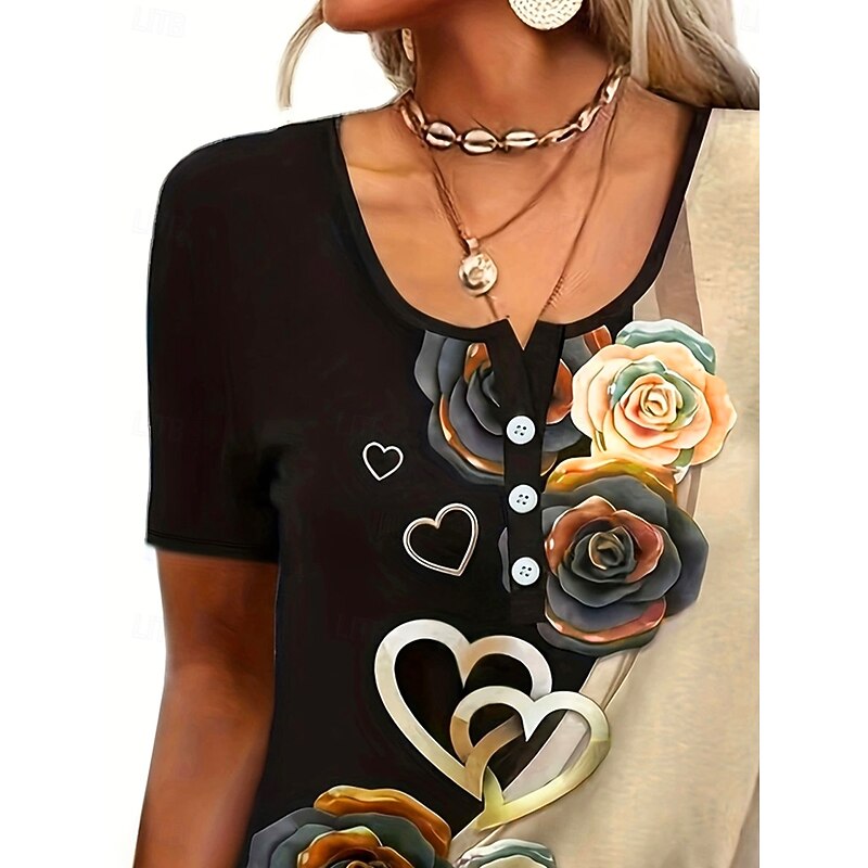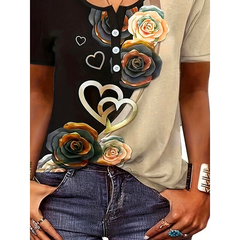 More information about Women's T Shirt Casual Ombre Floral Buttons Short Sleeve Regular Tops U Neck Daily Rose Gold Khaki Summer