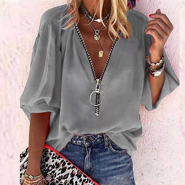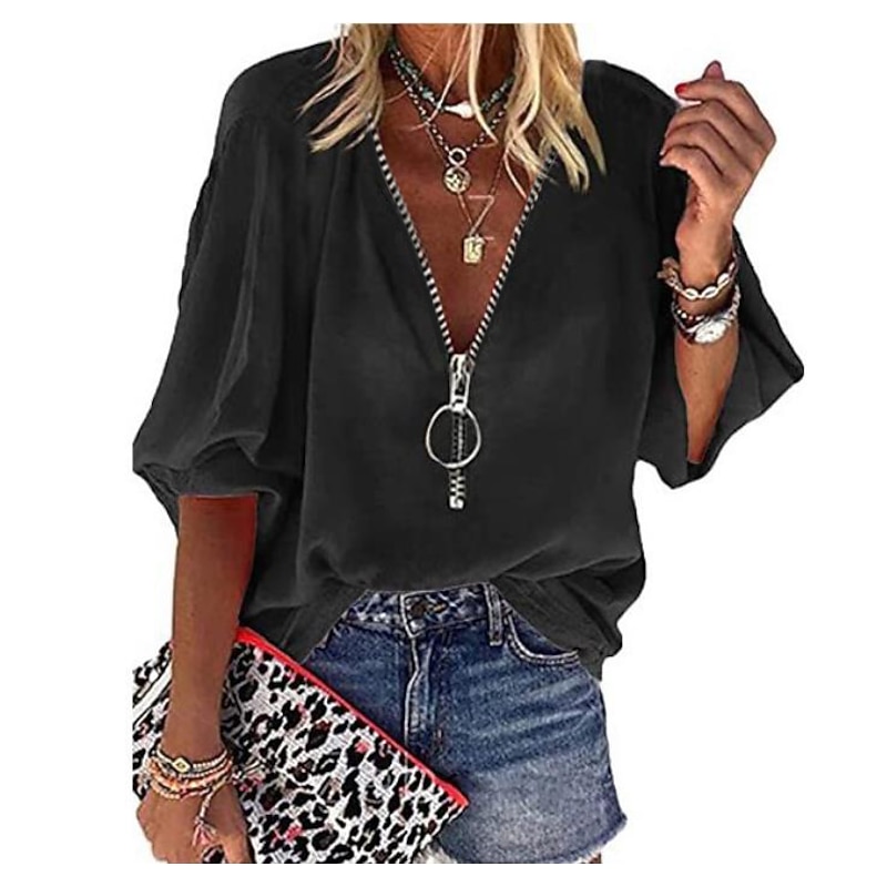 Women's Shirt Blouse Marron Black White Plain Zipper 3/4 Length Sleeve Casual V Neck Regular S 10
