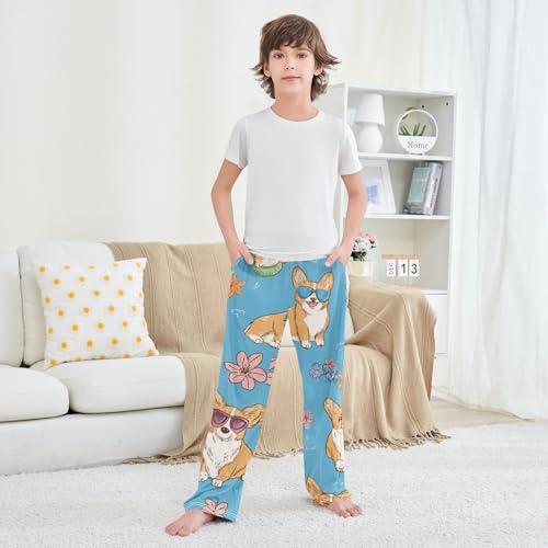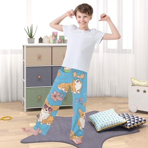 HOT ! Corgi Dog with Glasses Boys Long Pants Soft Trousers Elastic Waist Kids Lounge Bottoms with Pockets S-XL
