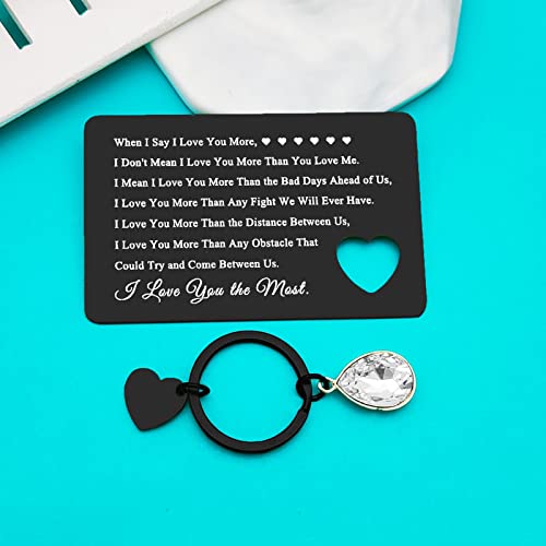 • Wallet Card for Men: Engraved with sweet words “When I say I love you more, I don't mean I love you more than you love me. I mean I love you more than the bad days ahead of us, I love you more than any fight we will ever have. I love you more than the distance between us, I love you more than any obstacle that could try and come between us. I love you the most” with an additional cutout keychain.