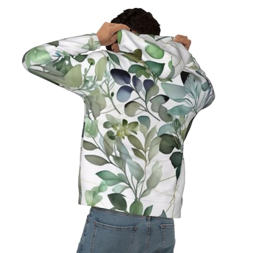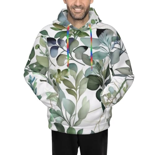 HOT ! Mens Hoodie Pullover Casual Long Sleeve Drawstring Top Green Eucalyptus Leaves Print Hooded Sweatshirt With Pocket