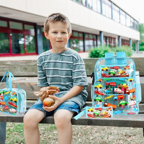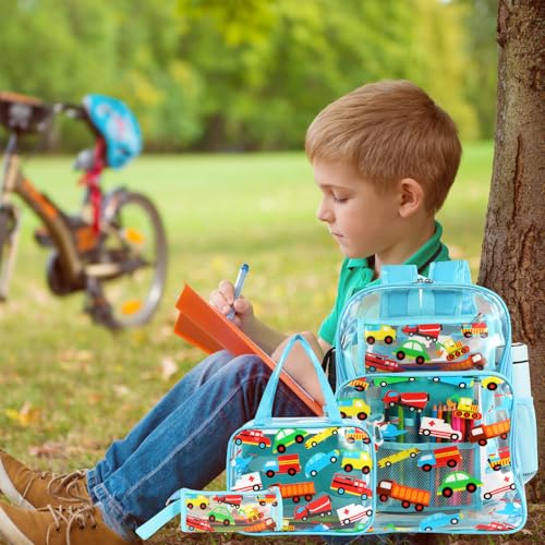 HOT ! Kolewo4ever 3 Pieces Clear School Backpack Set Elementary Kindergarten Back to School Gift Trains, Planes, and Trucks Transparent Backpack with Lunch Bag and Pencil Pouch