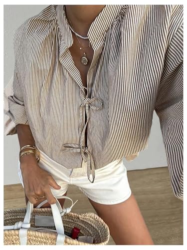 HOT ! SweatyRocks Women's Striped Bow Long Sleeve Shirts Tie Front Loose Blouse Going Out Tops