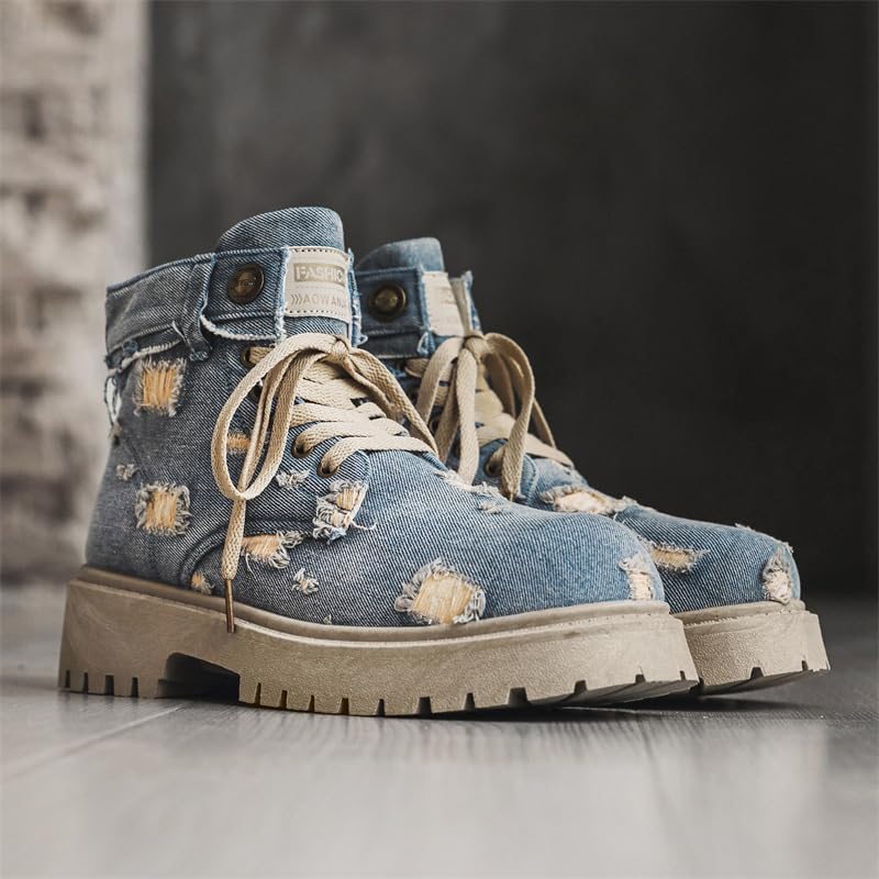 HOT ! Men's Retro Denim High-Top Sneakers Durable Thick Sole Lace-Up Casual Shoes for Outdoor & Everyday Wear