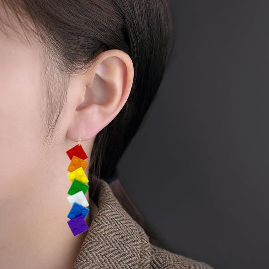 • Appearance design This pair of lego brick earrings takes classic building blocks as its design elements, featuring a long and stacked arrangement. The colors are bright and rich, covering red, orange, yellow, green, white, blue, purple and other hues, as brilliant as a rainbow and highly visually striking. The unique building block design is different from the common earring styles, full of fun and creativity. It is both retro and fashionable, and can easily catch others' eyes