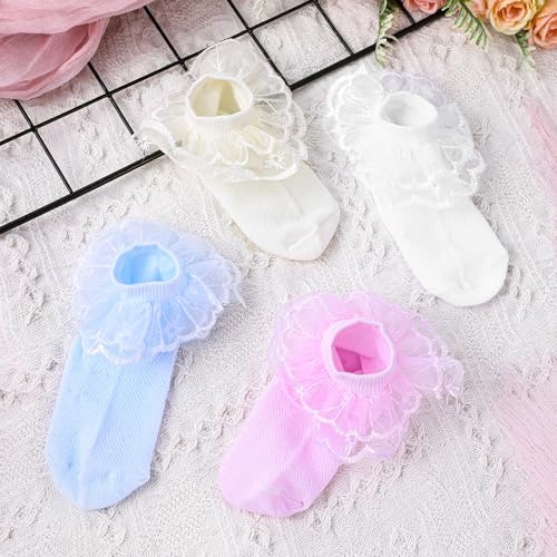 4 Pairs Girls Ruffle Socks, Double Lace Frilly Turn Cuff Socks, Toddler Pageant Dress Socks (White, Pink, Yellow, Blue) 2